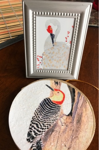 | The artist down the street had an open house today featuring bird art. I had bought a watercolor she made years ago at a thrift store for a dollar of a house finch. She is selling similar paintings for about $70. I did buy the above ornament featuring a red bellied woodpecker that I now hang over my back door. Mr Red bellied woodpecker finally came back yesterday after a 6 month absence to my suet cake. His mate hasn't shown up yet. Included in every purchase was a little gift. In my case, a miniature whooping crane with bittersweet. Also she had lots of treats..not good for yours truly. Seven layer bars..who can resist? |