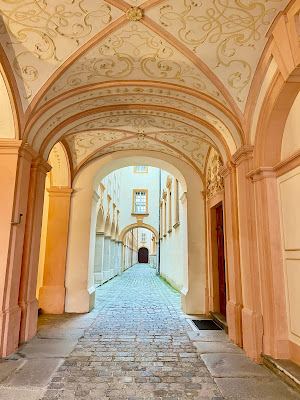 The main attraction of MElk is an extremely ornate abbey high on a hill. I was very annoyed when we were told no interior photos would be allowed as it would cut into their gift shop sales. So I wouldn’t even go into their gift shops. We paid money to see the abbey, I think we should be able to take pictures. I did sneak a few photos of the staircase by lagging behind though the guide said something about how slowly I climb stairs. The place was encased in fog Afterwards we walked down to the town which was very cute before finding the boat.